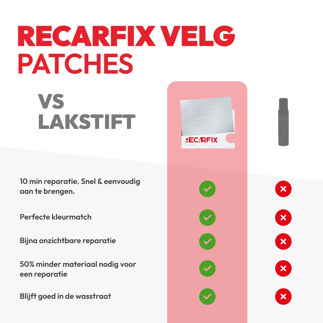 Met de Recarfix patch verberg je, geheel eenvoudig, die lelijke beschadiging op je velg(en). Je hoeft het alleen schoon te maken, te ontvetten en de patch te plaatsen! Is de schade wat lastiger? Ook dan kan je met Recarfix eenvoudig je velg herstellen.